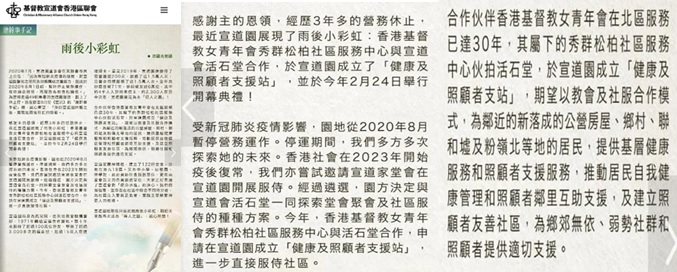 本期區聯會刋物《宣訊》內「總幹事手記專欄」,特別提及宣道園新動態,園地除了是本堂借用作發展教會接觸及服侍社區街坊的平台,文章更進一步介紹本區社福機構香港基督教女青年會與本堂於園內合作之項目:「健康及照顧者支援站」,善用該園地作為社區平台,接觸不同街坊,進一步直接服侍社區。誠如區聯會總幹事范國光牧師於文章期望:「以教會及社服合作模式,為鄰近的新落成的公營房屋、鄉村、聯和墟及粉嶺北等地的居民,……提供適切支援。」